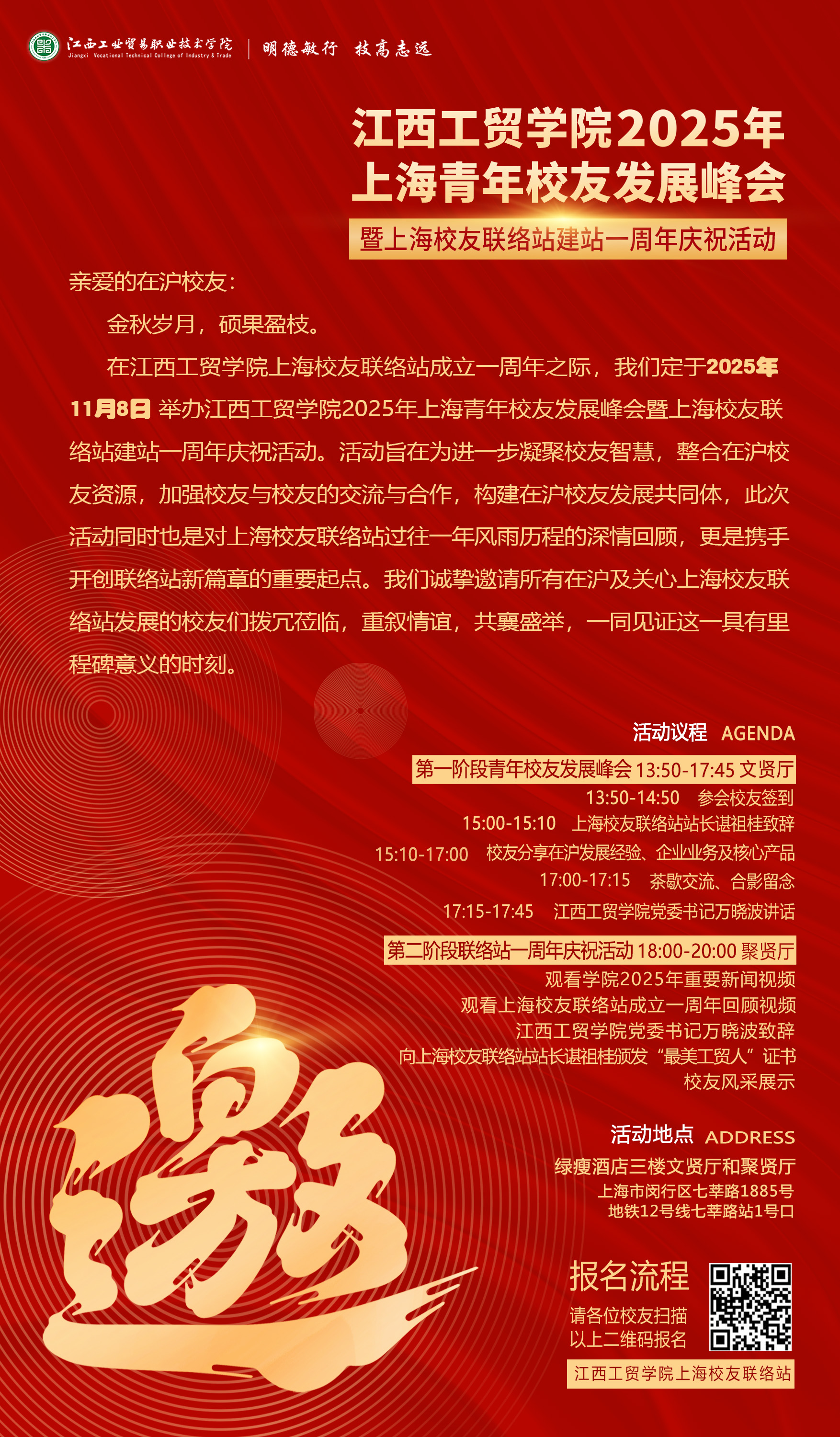 金秋岁月,硕果盈枝。在江西工贸学院上海校友联络站成立一周年之际,我们定于2025年11月8日举办江西工贸学院2025年上海青年校友发展峰会暨上海校友联络站建站一周年庆祝活动。活动旨在为进一步凝聚校友智慧,整合在沪校友资源,加强校友与校友的交流与合作,构建在沪校友发展共同体,此次活动同时也是对上海校友联络站过往一年风雨历程的深情回顾,更是携手开创联络站新篇章的重要起点。我们诚挚邀请所有在沪及关心上海校友联络站发展的校友们拨冗莅临,重叙情谊,共襄盛举,一同见证这一具有里程碑意义的时刻。具体如下: