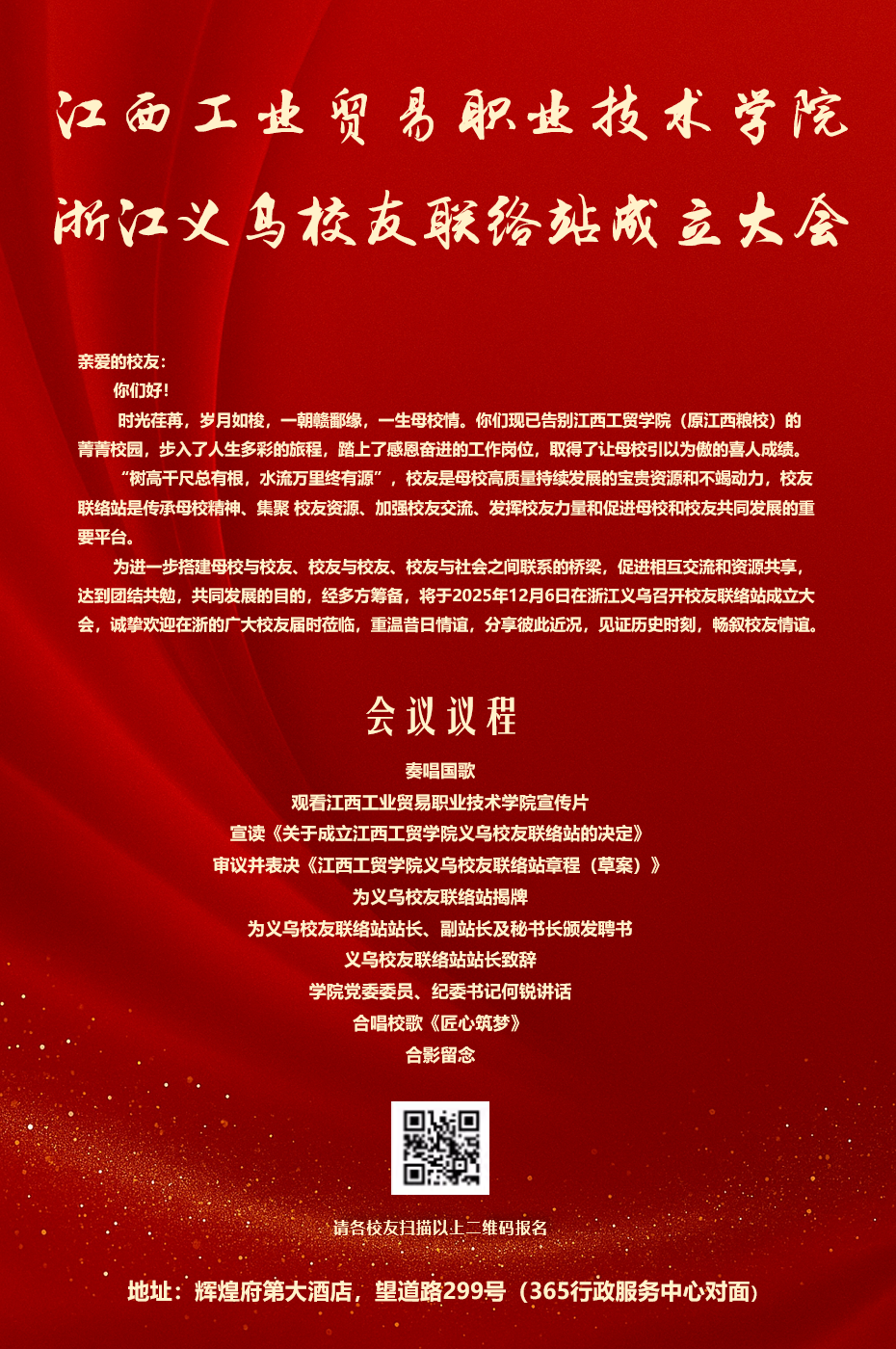 为进一步搭建母校与校友、校友与校友、校友与社会之间联系的桥梁,促进相互交流和资源共享达到团结共勉,共同发展的目的,经多方筹备,将于2025年12月6日在浙江义乌召开校友联络站成立大会,诚挚欢迎在浙的广大校友届时莅临,重温昔日情谊,分享彼此近况,见证历史时刻,畅叙校友情谊。