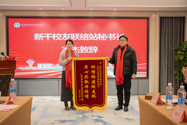 新干校友联络站秘书长凌杰到会祝贺并致辞。他代表新干校友联络站送上“倾情搭建校友桥,丹心共叙母校情”的锦旗。新任站长罗素娟在致辞中深情回顾了在母校的求学时光,表达了对母校培育之恩的感激。