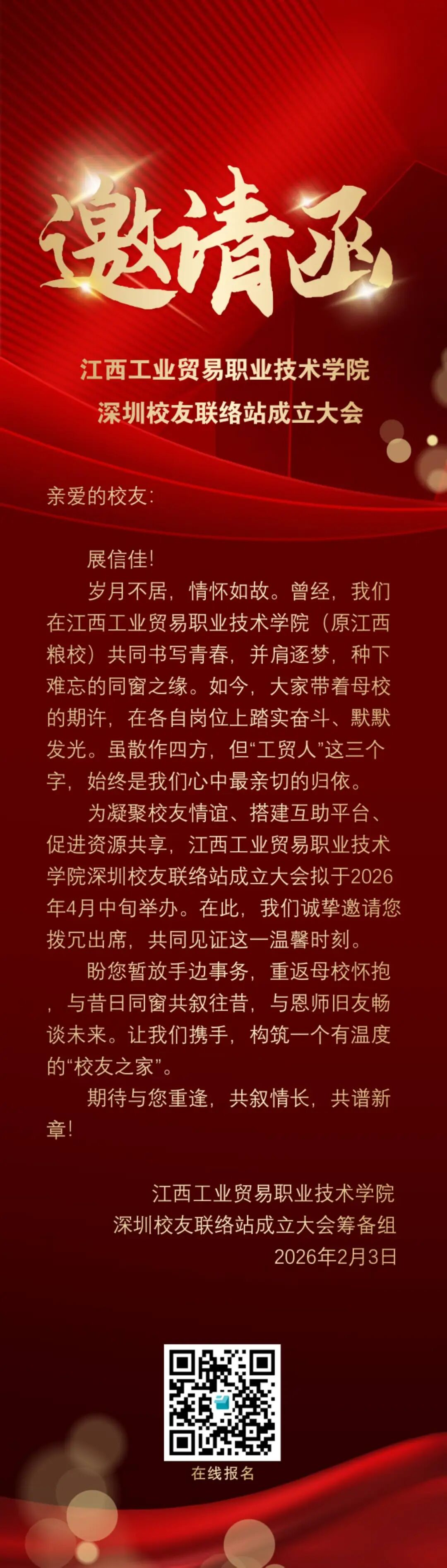 为凝聚校友情谊、搭建互助平台、促进资源共享,江西工业贸易职业技术学院深圳校友联络站成立大会拟于2026年4月中旬举办。在此,我们诚挚邀请您拨冗出席,共同见证这一温馨时刻。