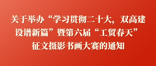 为深入学习宣传贯彻党的二十大精神,弘扬伟大建党精神,抒发学院师生和广大校友爱党爱国爱校的真挚情怀,进一步丰富全体师生和广大校友的精神文化生活,凝聚奋进新征程、建功新时代的强大力量,为学院“双高计划”建设提供坚强思想保证和精神动力。根据学院党委工作安排,决定举办“学习贯彻二十大,双高建设谱新篇”暨第六届“工贸春天”征文摄影书画大赛。现就有关事项通知如下: